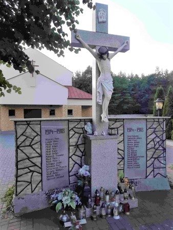 Denkmal für die Gefallenen des Ersten Weltkriegs: Wand mit zwei Namenstafeln und zentralem Kreuz mit Christusfigur.