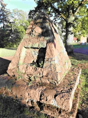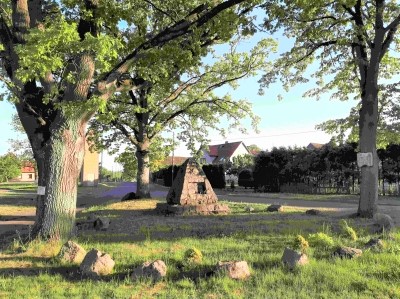 Denkmal für die Gefallenen des Ersten Weltkriegs aus Natursteinen: Zweistufiger Sockel mit aufgesetzter Pyramide und Stahlhelm-Relief im oberen Bereich. In einer Vertiefung war eine Widmungstafel eingelassen, die heute fehlt. Das Denkmal wird umkreist von vielen Feldsteinen und einigen alten Eichen.