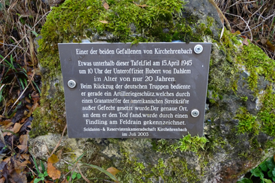 Findling mit Gedenkplatte für einen von zwei Soldaten, die in den letzten Kriegstagen fielen.