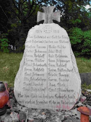 Denkmal für die Gefallenen des Ersten Weltkriegs: Feldsteinmauer mit aufgerichtetem Findling und krönendem EK-Zeichen.