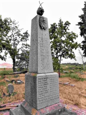 Auf dem ehemaligen evangelischen Friedhof befindet sich ein gut erhaltenes Denkmal für die Gefallenen des Ersten Weltkriegs. Es hat die Form eines Quaders mit aufgesetztem Obelisken mit Eichenlaub im oberen Bereich und krönender Kugel mit Adler. Der Adler wurde abgerissen, aber seine Krallen und die haltenden Gestänge sind noch auf der Kugel erkennbar. Unterhalb des Eichenlaubs sind noch zwei Bohrungen, an denen wahrscheinlich ein EK-Zeichen befestigt war.
