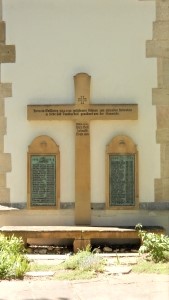 die rechts und links eines Steinkreuzes angebracht sind, den Gefallenen des Ersten und Zweiten Weltkriegs gedacht.