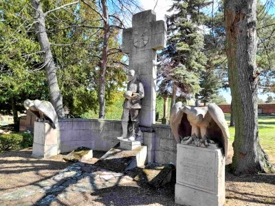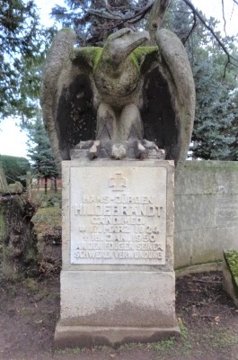 Privates Grab-Denkmal für die Verstorbenen der Familie Hildebrandt auf dem städtischen Friedhof: Großes Kreuz mit davorstehender trauernden Soldatenfigur und flankiert von halbrunden Wänden mit Adler-Figuren auf den Enden.