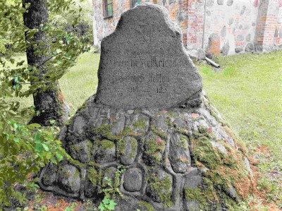 Denkmal für die Gefallenen des Ersten Weltkriegs neben der Kirche: Stumpfe Pyramide aus Feldsteinen mit aufgesetztem Findling (ohne Namen).