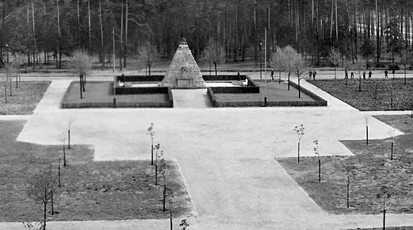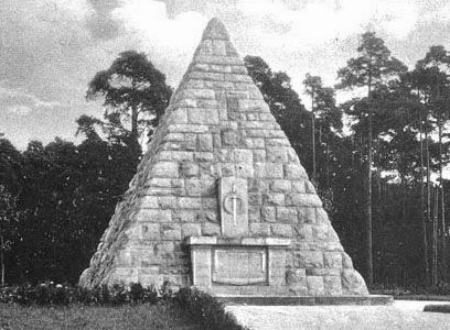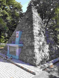 Große Natursteinpyramide auf dem zentralen Miejski-Platz mit herausragender Widmungstafel und Stein mit Schwert und Ehrenkranz (heute in ein polnisches Denkmal umgestaltet).