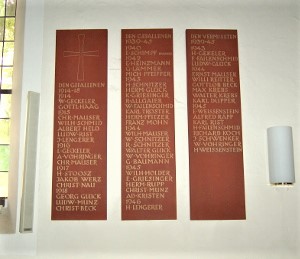 In der Kirche drei Gedenktafeln mit den Namen der Gefallenen beider Weltkriege.