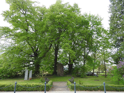 mit Kreuz und Eichenlaub, versehen mit zwei beschrifteten Steintafeln.