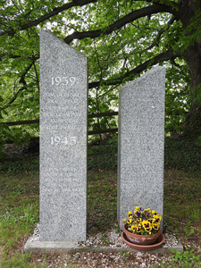 Links zwei Granitsäulen, von denen die höhere linke die Jahreszahlen und Gedenkinschrift trägt,