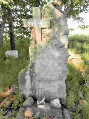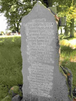 Denkmal für die Gefallenen des Ersten Weltkriegs auf dem ehemaligen evangelischen Friedhof am nördlichen Rand des Dorfes: Aufgerichteter Steinblock mit Kreuz im oberen Bereich und den Namen auf der Rückseite.
