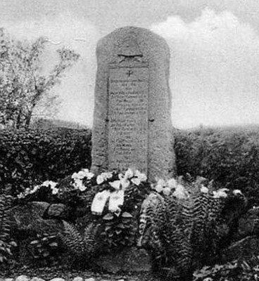 Denkmal für die Gefallenen des Ersten Weltkriegs. Aufgerichtete Granitplatte mit Stahlhelm-Relief im oberen Bereich.