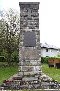 Aud bearbeiteten Natursteinen bemauerte quatratische Säule. Oben ein großes Deutsches Kreuz, darunter zwei Gedenktafeln.