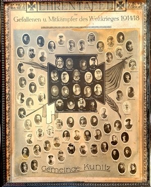 Eine Ehrentafel mit Fotos der Gefallenen, Vermissten und sonstigen Kriegsteilnehmer des Dorfes Kunitz.