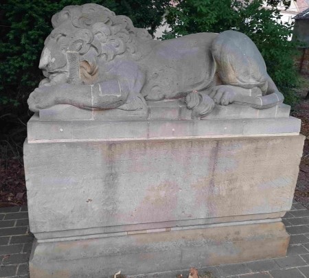 Denkmal für die Gefallenen des Ersten Weltkriegs in Form eines Quaders mit der Figur eines schlafenden Löwen darauf und EK-Zeichen an den schmalen Enden. In der Nähe des ehemaligen Palastes der Familie Saurma-Jeltsch befindet sich dieses Gefallenendenkmal für Laskowitz. Ca. 2/3 der Namen wurden im unteren Teil herausgeschlagen. Sonst ist das Denkmal in einem guten Zustand.