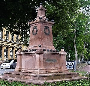 angebrachten Kanonenkugeln und einer eingelassenen Widmungstafel.