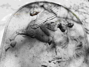 Eine Sandstein-Stele mit dem Relief eines Pegasus mit einem nackten Reiter, der von einer Explosion unter dem Pferd getroffen wird und nach hinten fällt.