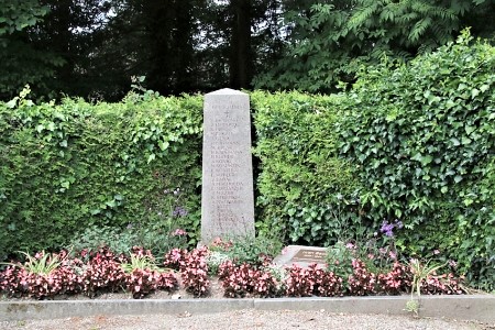 Im Aeschbacher Friedhof: Steinsäule mit Namen, daneben am Boden Tafel mit Plakette.
