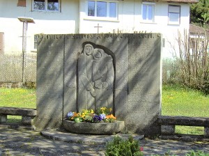 Denkmal aus drei Teilen, außen Namen Gefallener beider Weltkriege, in der Mitte zwei trauernde Frauen mit Kind; oben eine Inschrift mit Kreuz.