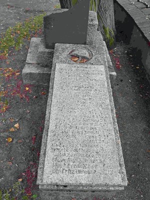 Das Denkmal mit seinen Teilen liegt heute gut erhalten flach auf dem Boden an der Kirchhofmauer.