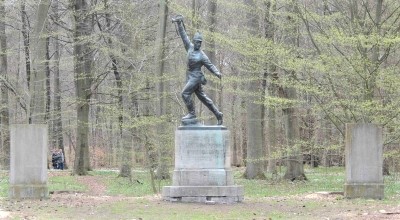 Denkmal für die Gefallenen des Großherzoglich Mecklenburgischen Jäger-Bataillons Nr. 14 im Ersten Weltkrieg im Schlosspark: Quader mit Widmung, darauf Bronze-Standbild eines vorstürmenden Jägers, der ein Horn hochhält und einen Dolch in der anderen Hand hält. Dahinter zwei aufgerichtete Steinplatten mit den Namen der Gefallenen.