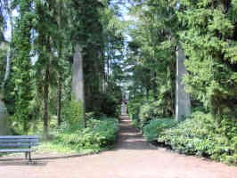 Auf dem Zentralfriedhof: Am Obelisken für den Krieg 1870/71 führt ein Weg durch den Ehrenhain 2 (Opfer des Zweiten Weltkrieges) zum Ehrenhain 1 (Opfer des Ersten Weltkrieges).