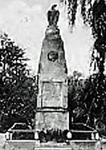 Denkmal für die Gefallenen des Ersten Weltkriegs: Abgestufter Obelisk mit eingelassenen Widmungs- und Namenstafeln, Stahlhelm-Relief im oberen Bereich und krönenden ruhenden Adler (alles abgerissen).