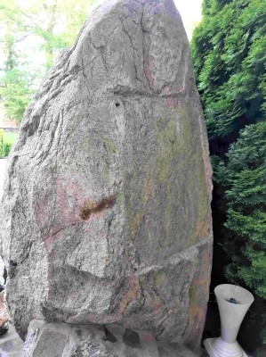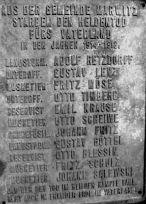 Ehemaliges Denkmal für die Gefallenen des Ersten Weltkriegs: Aufgerichteter Findling mit Aussparung, in die früher eine Widmungs- und Namenstafel eingelassen war. Der Stein wurde halbiert und trägt nun an der glatten Fläche eine christliche polnische Inschrift und die Aussparung ist nun auf der Rückseite. Die Tafel soll sich noch in der Kirche befinden.