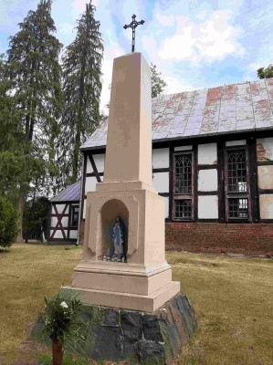Denkmal für die Gefallenen des Ersten Weltkriegs vor der Kirche: Natursteinsockel mit abgestuftem Obelisken. Die deutschen Inschriften wurden übermalt und eine Öffnung eingefügt, in die eine Marienstatue aufgestellt wurde.