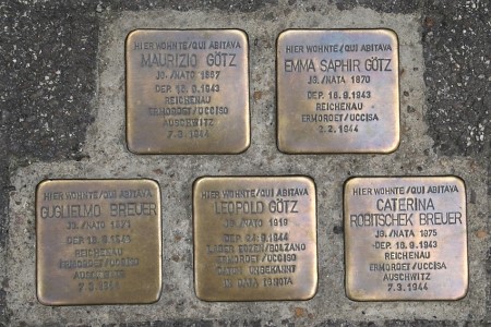 An diversen Straßen. Die Stolpersteine sind 2-sprachig beschriftet (deutsch u. italienisch).