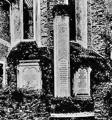 und zwei flankierenden überdachten und verzierten Sandstein-Namenstafeln an der gewölbten Wand.