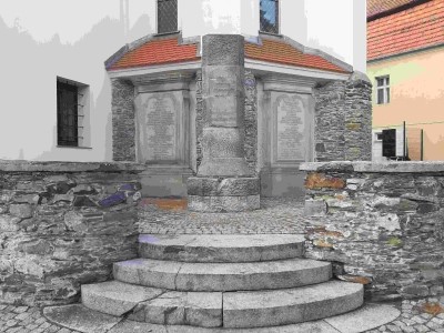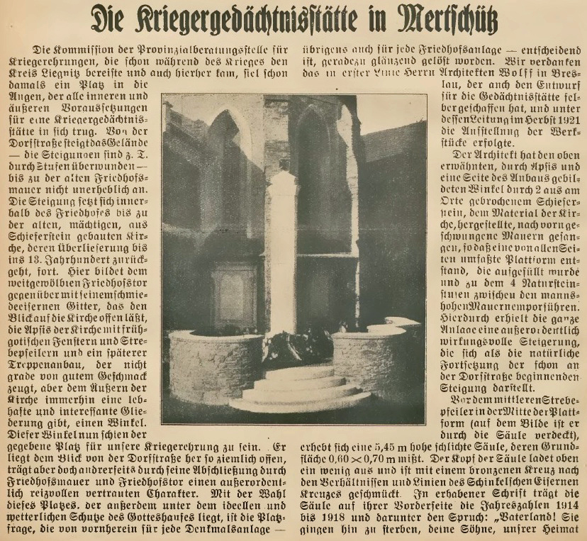 Die Kommission der ProvinziaIberatungstelle für Kriegerehrungen, die schon während des Krieges den Kreis Liegnitz bereiste und auch hierher kam, fiel schon damals ein Patz in die Augen, der alle inneren und äußeren Voraussetzungen für eine Kriegergedächtnistätte in sich trug. Von der Dorfstraße steigt das Gelände - die Steigungen sind z. T. durch Stufen überwunden - bis zu der alten Friedhofsmauer nicht unerheblich an. Die Steigung setzt sich innerhalb des Friedhofes bis zu der alten, mächtigen, aus Schieferstein gebauten Kirche, deren Überlieferung bis ins 13. Jahrhundert zurückgeht, fort. Hier bildet dem weitgewölbten Friedhofstor gegenüber mit seinem schmiedeeisernen Gitter, das den Blick auf die Kirche offen läßt, die Apsis der Kirche mit frühgotischen Fenstern und Strebepfeilern und ein späterer Treppenanbau, der nicht grade von gutem Geschmack zeugt, aber dem Äußern der Kirche immerhin eine lebhafte und interessante Gliederung gibt, einen Winkel. Dieser Winkel nun schien der gegebene Platz für unsere Kriegerehrung zu sein. Er liegt dem Blick von der Dorfstraße her so ziemlich offen, trägt aber doch andrerseits durch seine Abschließung durch Friedhofsmauer und Friedhofstor einen außerordentlich reizvollen vertrauten Charakter. Mit der Wahl dieses Platzes, der außerdem unter dem ideellen und wetterlichen Schutze des Gotteshauses liegt, ist die Platzfrage, die von vornherein für jede Denkmalsanlage - übrigens auch für jede Friedhofsanlage - entscheidend ist, gerade zu glänzend gelöst worden. Wir verdanken das in erster Linie Herrn Architekten Wolff in Breslau, der auch den Entwurf für die Gedächtnisstätte selber geschaffen hat, und unter dessen Leitung im Herbst 1921 die Aufstellung der Werkstücke erfolgte.