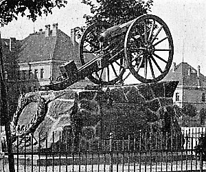 französische Mitrailleuse stand. An den Seiten waren zwei Widmungstafeln, sowie ein bronzener Lorbeerkranz mit