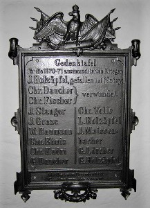 Bei der Blumenhardt-Kirche an der Kirchenwand eine Gedenktafel für 1870/71 (ausmarschierenden Krieger),