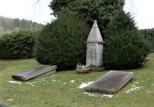 daneben zwei liegende Steinplatten mit den Namen des Zweiten Weltkriegs.