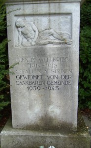 Gedenkstein mit Inschrift der Gemeinde, an beiden Seiten Namen der Gefallenen des Ersten Weltkriegs,