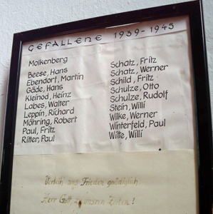 Gedenkblatt für die Opfer des 2. Weltkriegs in der Kirche und im Pfarramt Schollene.