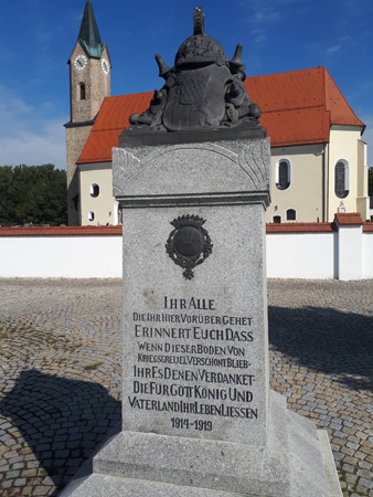 Denkmalstele für die Gefallenen des 1. Weltkriegs vor dem Friedhof.