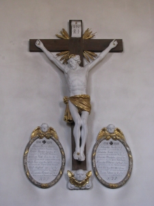 Zwei Gedenktafeln in der Kirche St. Georg mit Namen und Daten der Gefallenen des 1. Weltkrieges. Dazwischen ein Kreuz mit Korpus.