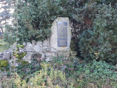 Unmittelbar im Straßeneinmündungsbereich, auf einer gesonderten dreieckigen Fläche, steht ein kleine Anlage aus grob behauenen Feldsteinen.