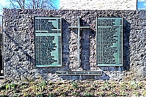 Metallene Gedenktafeln mit Kreuz neben dem Eingangstor im Friedhof.