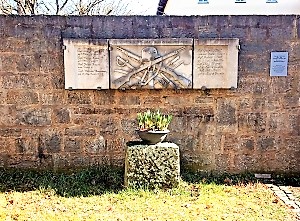 An der Außenmauer, links vom Eingang des Friedhofs sind zwei Gedenktafeln mit den Daten im 1. Weltkrieg gefallener Schüler angebracht.