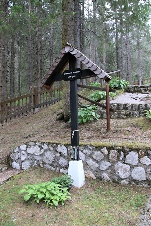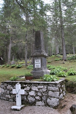 Im Soldatenfriedhof, zwei Denkmäler, ein Kreuz mit Plakette und ein Denkmal aus Stein mit Tafel und davor ein kleines weißes Kreuz.
