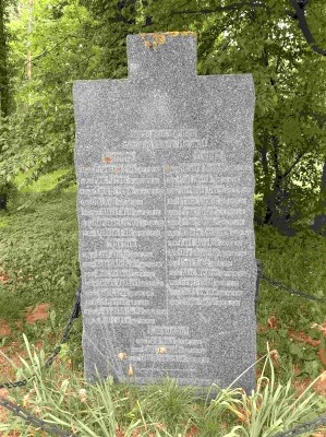 Denkmal für die Gefallenen des Ersten Weltkriegs: Aufgerichtete Granitplatte vor der Kirchenmauer.
