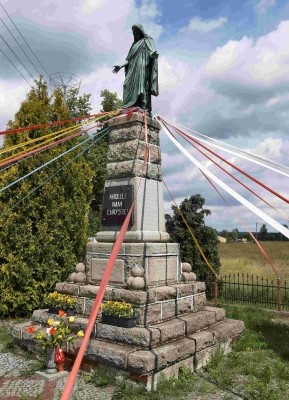 Nach 1945 wurde in Hinterpommern die deutsche Bevölkerung vertrieben und die meisten Denkmäler abgerissen, beschädigt oder umgewidmet. Dieses Denkmal wurde verstümmelt und jeder einzelne deutsche Buchstabe herausgemeißelt.