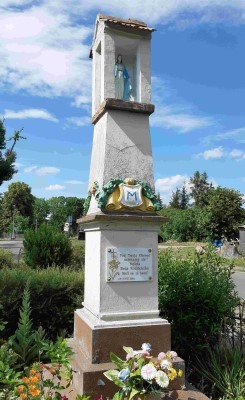 Denkmal für die Gefallenen des Ersten Weltkriegs: Abgestufte und verzierte Stele mit EK-Zeichen im oberen Bereich. Nach 1945 wurden alle Inschriften dick übertüncht, die Verzierungen und das EK abgeschlagen und eine überdachte Marienfigur aufgesetzt.