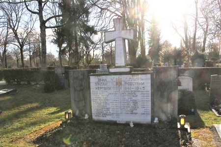 Im Friedhof: Gedenkwand mit weißer Marmorplatte, oben weißes Kreuz, Namen und Texte in kyrillischer Schrift.