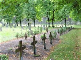 Ein großer Teil des Friedhofes ist für Gefallene/Gestorbene angelegt, die nach Ende des Zweiten Weltkrieges hier gestorben sind. Ein hohes Steinkreuz steht im Hintergrund der Anlage.