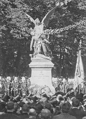 Ehemaliges Denkmal für die Gefallenen des Krieges 1870/71: Abgestufte Stele mit krönender Figur eines fallenden Soldaten, der von einem Engel gestützt wird (abgerissen).
