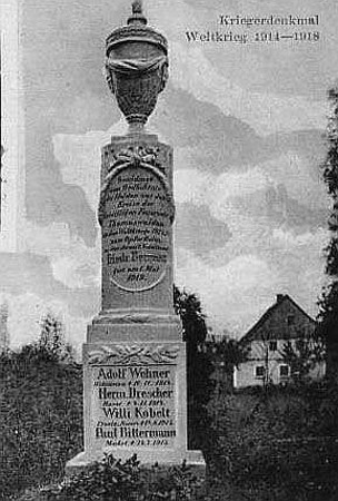 Denkmal für die Gefallenen des Ersten Weltkriegs: Quader mit aufgesetzter verzierter Säule und krönender Urne (abgerissen).