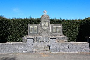 Bearbeiteter Steinfindling mit aufgesetztem Deutschen Kreuz. Daneben zwei Gedenkplatten aus bearbeiteten Natursteinen.