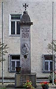 Kriegerdenkmal Kubus mit eckiger Säule. Als Abschluss ein Deutsches Kreuz.